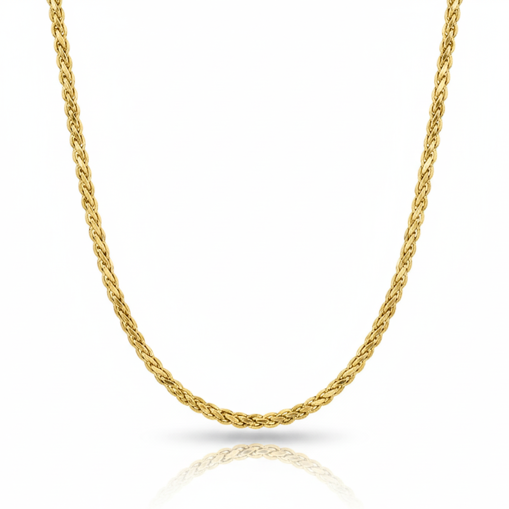This gold-plated chain features a detailed rope-style weave, offering both texture and shine. Its symmetrical twists catch the light gracefully, giving it a bold yet refined presence. Ideal for daily elegance or pairing with pendants for a personalized touch.