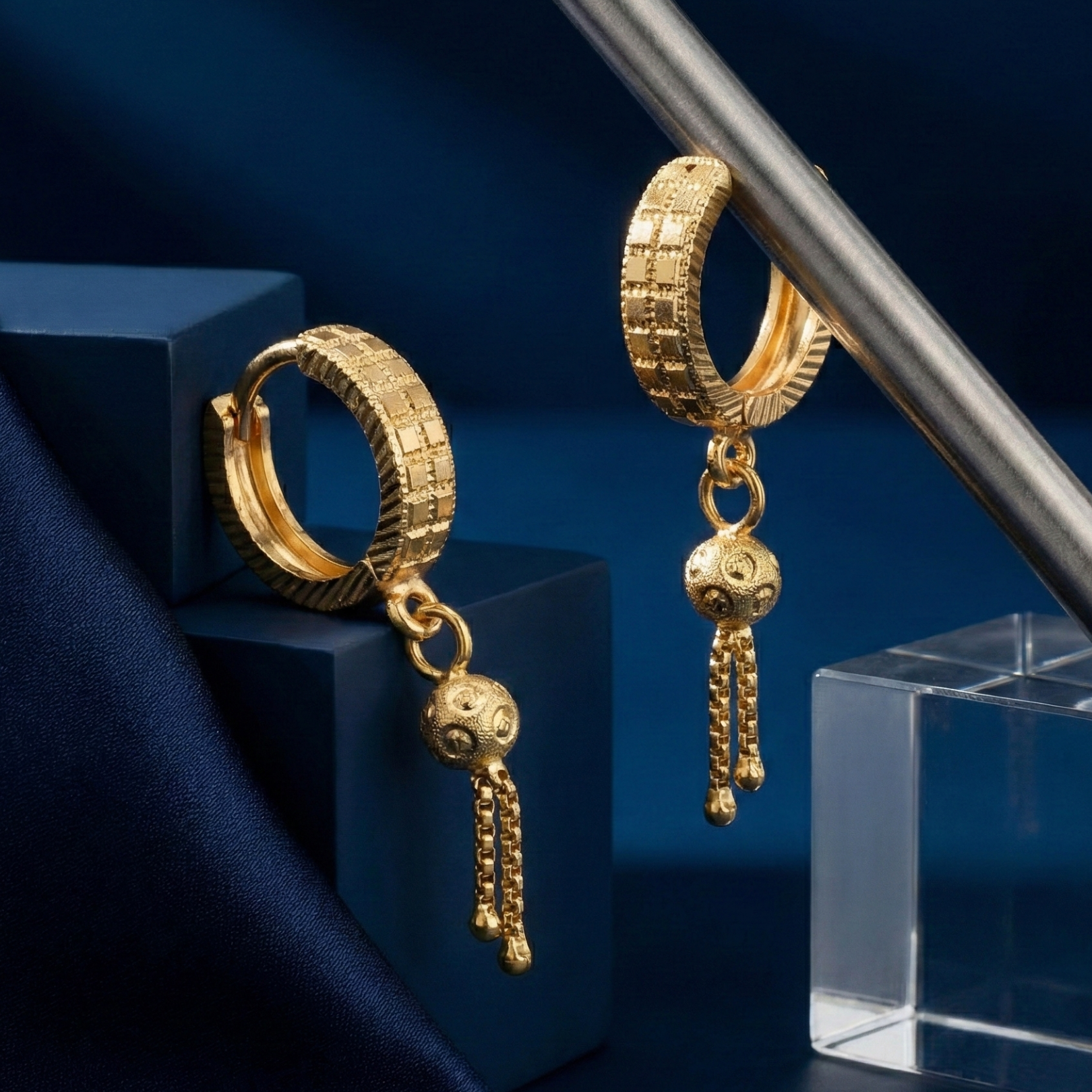 Crafted from durable brass and finished with a brilliant 18K gold plating, these hoops feature a bold band with a distinctive, horizontal textured pattern. The meticulous lines create a rich, architectural look. From the base of each hoop hangs a beautiful dangle, composed of a larger textured bead and a cascade of two smaller, polished beads. The combination of the striking pattern and the fluid dangle creates a captivating look that is both contemporary and graceful. Their secure hinged closure makes them comfortable for all-day wear, adding a touch of sophisticated rhythm to any outfit.