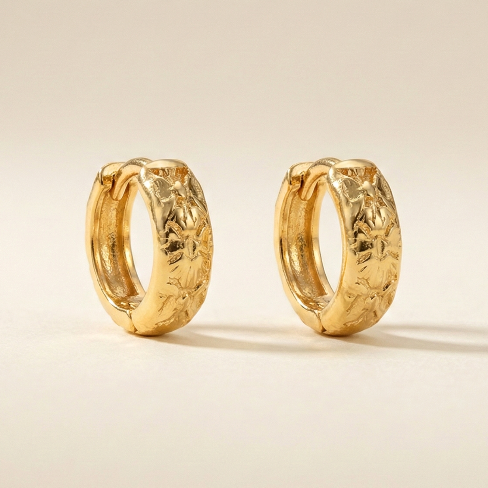 Crafted from durable brass and finished with a rich 18K gold plating, these small hoops—or "huggies"—feature a thick, bold band with a deeply embossed, continuous vine and abstract floral pattern. This intricate texture gives the hoops a luxurious, vintage-inspired look and a substantial feel. The secure hinged closure ensures a comfortable, snug fit for all-day wear. These are a perfect statement piece to add an artistic, textured touch to your everyday jewelry collection.
